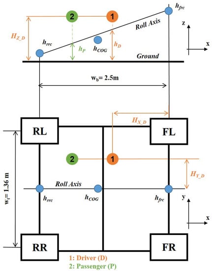 where and are the driver’s () and the passenger’s () coordinates in the Y and the Z axis, respectively. The height of roll axis () at distance from the front axle ( ) is defined as follows: