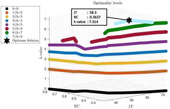 According to Figure 7, the optimum solution, which has managed to compromise all the objectives including in Equation (41), is located at = . The k-value of this solution is , which means it is dominating the rest of the objectives by out of 9 (the value that the utopia point should have). More specifically, the solution converged close to the middle of the Pareto Frontiers which is the solution that compromises effectively all the conflicting relations that were illustrated in the previous section.