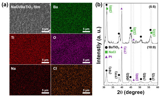(a) SEM micrograph and EDS images of NaCl/BaTiO3 (50:50) composite film. (b) XRD analysis of as-deposited BaTiO3 single layer and NaCl/BaTiO3 (50:50) composite film.