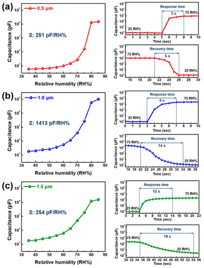 Humidity sensing abilities with different RH values ranging from 35 RH% to 85 RH% for (a) 0.5, (b) 1.0, and (c) 1.5 µm-thick composite layers. Response and recovery times for NaCl/BaTiO3 composite films were measured under a sudden humidity change from ambient humidity to 75 RH% and vice versa.