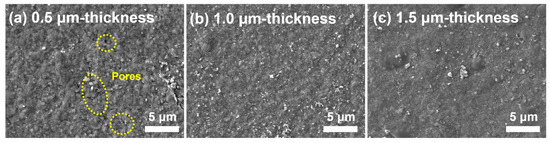 Variation in the surface microstructures of NaCl/BaTiO3 composite film when gradually increasing layer thickness to (a) 0.5 µm, (b) 1.0 µm, and (c) 1.5 µm.