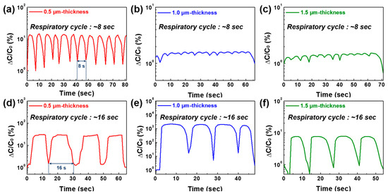 Respiration monitoring of NaCl/BaTiO3 humidity sensors with different layer thicknesses of 0.5, 1.0, and 1.5 µm. Each humidity sensor monitored two types of respiratory cycles of (a–c) 8 s and (d–f) 16 s.