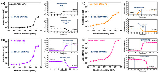 Figure 5 depicts the comparative sensing capabilities involving the humidity sensitivity and response/recovery time for sensors with different NaCl ratios. The humidity sensitivity was significantly improved by increasing the NaCl ratio in the composite film. The sensitivity of sensing layers containing less than NaCl-50 wt% was enhanced at a constant rate of approximately 4 times, whereas the NaCl-75 wt% film showed an extremely high sensitivity of 4535 pF/RH% compared to the NaCl-50 wt% film (approximately 18 times). Simultaneously, both the response and recovery times decayed with an increasing NaCl ratio, which implies that the NaCl filler in the composite film resulted in a trade-off relationship between the sensitivity and humidity reaction time.