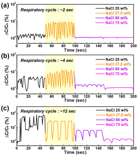 Since the NaCl-37.5 wt% film has a higher sensitivity than the NaCl-25 wt% film, its signal variation is more distinct despite the slightly slow response/recovery time. These variation rates are in line with the excellent data recently reported on moisture sensors focused on respiratory patterns (Table 1) [33,68,69,70,71,72,73]. In addition, although the humidity sensitivities of the NaCl-50 and 75 wt% films are significantly high, fast respiratory patterns cannot be observed due to their slow response/recovery times. The respiratory patterns of the NaCl-50 wt% film are observed when the respiratory cycle is increased up to 12 s (Figure 7b,c); the NaCl-75 wt% film, with the highest sensitivity among our samples, does not show a clear signal variation despite a longer breathing period of 12 s. In addition, although the NaCl-25 wt% film had a very fast response/recovery time of 1/2 s, respiration monitoring was not observed in the case of a longer breathing period because of its low sensitivity, which easily causes unstable signals under sudden humidity changes. This result demonstrates that humidity sensitivity is important for realizing real-time respiration monitoring; however, the electrical conductivity under a sudden humidity change should have a quick response/recovery time.