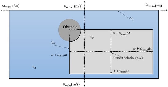 In this work, DWA was selected as the basic algorithm given that it can solve the dynamic obstacle avoidance problem. The traditional DWA takes the limitations of velocity and acceleration and aims for a collision free trajectory, thereby forming a dynamic window with sampled velocity. Then, an optimal trajectory was selected from this dynamic window based on the designed evaluation function. The current optimal trajectory was continuously searched by repeating iterations until the target point was reached. Figure 1 is the velocity vector space diagram of the DWA [23,24]. The vertical and horizontal axis represent the linear velocity and the angular velocity, respectively. Va represents the feasible velocity region to avoid collision. The speed range of the USV was also limited by its own performance, so Vs represents all the speed ranges it can reach and Vd represents the speed ranges it can reach in the next iteration cycle, where Vd is expressed by Equation (1).