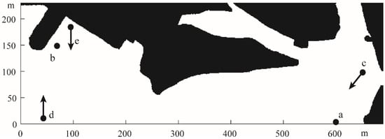 Figure 4 illustrates the detailed setting of the simulation experiment, where a and b are the navigation’s starting point and endpoint, respectively, and c, d and e are the dynamic obstacles in this simulation. At t = 0, c, d, and e started moving in a straight line in the direction of 220°, 90° and −90° at a speed of 7.8 m/s, 0.6 m/s and 0.3 m/s, respectively. In the end, we evaluated the effectiveness of this method in terms of the generation of the final path, the path length, and the navigation time.