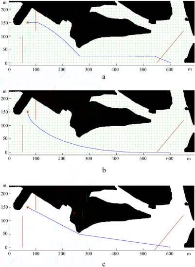 Figure 5 shows the calculated path of the USV under the mentioned three environmental conditions. The paths (Figure 5a,b) under wave loads were entirely different from the one under still water (Figure 5c), which proved that the environmental loads indeed had a significant impact on path planning. In addition, since the different directions of environmental loads led to different resistance and energy consumption during USV navigation, the path planning results under upward and downward environmental loads (corresponding to Figure 5a and Figure 5b, respectively) were also significantly different from each other. Moreover, the path planning algorithm reduced energy consumption by adjusting the heading angle reasonably, which also resulted in the different final calculated paths.