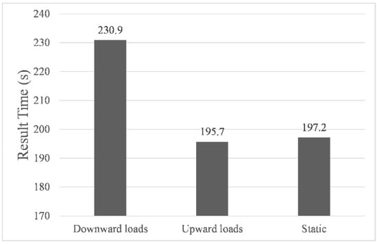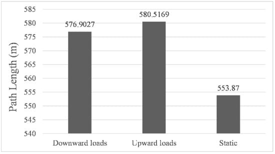 Figure 6, Figure 7 and Figure 8 showed the results of navigation time, path length, and average speed calculated under different environmental load conditions, respectively. Taking the results in still water as benchmarks, in upward load, the navigation time was shortened to 99.2%, the path length increased to 104.8%, and the average speed increased to 105.7%, while in downward load, the navigation time was prolonged to 117.1%, the path length increased to 104.2%, and the average speed was reduced to 88.9%. The above results indicate that the direction of the environmental load had a significant impact on the calculated navigation time and the shape of the final path, and the introduction of environmental load indeed enabled us to calculate the planning path with different parameters. It is worth noting that when the direction of the environmental load changed by 180°, the difference in path length calculated under upward and downward load conditions was only 3.6142 m, which proved that its correlation with the direction of the environmental load was very weak.