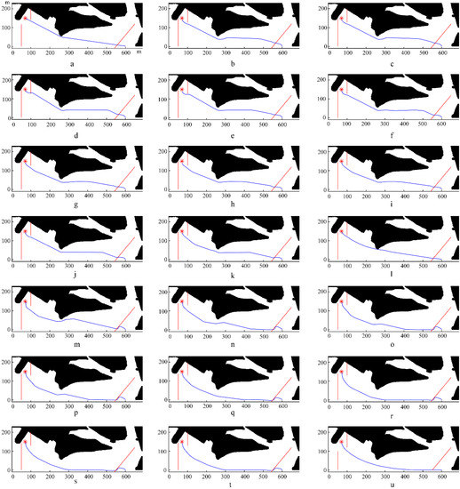 In the above, waves and currents with fixed intensity and different directions were used to test the effectiveness of our algorithm. This part will investigate the effect of environmental load intensity on the calculated USV path planning using the waves and currents with fixed direction and different intensities. In terms of the experimental parameters, the direction of waves and currents was set as −90°, and the environmental factor intensity set previously (wave height of 1 m; current velocity of 1.5 knots) was regarded as 1X. Then, starting from 0X, the environmental factor intensity gradually increased with intervals of 0.05X to check its impact on the planned paths. In Figure 9, the final simulated paths were arranged in ascending order according to the intensity of the environmental factors. The intensity multiples corresponding to Figure 9a,u were 0X and 1X, respectively. Table 2 summarizes the parameter results obtained from the simulation experiments under environmental factors with different intensities.