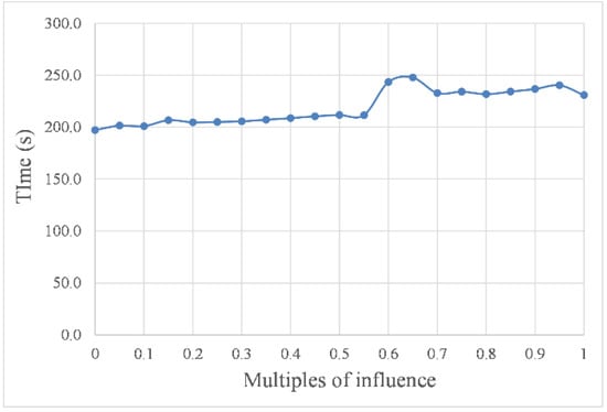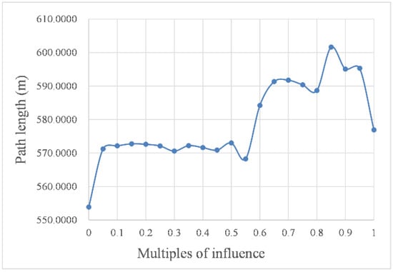 As shown in Figure 10 and Figure 11, with increasing intensity, the impact of the marine environment factors on USV path planning resulted in a step-like curve. In other words, when the intensity was within the threshold, the value of the influence remained stable, but when the intensity was out of this threshold, the value of the influence changed significantly. For example, the curves in the abscissa range of 0.05 to 0.5 were almost horizontal in Figure 10 and Figure 11, and the corresponding planned path shapes, as shown in Figure 9b–k, were very similar. However, these curves had a sharp change at the abscissa of 0.5. In addition, compared with the curves in the abscissa range of 0.05 to 0.5, the curves in the abscissa range of 0.55 to 1.00 had a more significant change. Taking the path length in still water as the benchmark, the change rate of the path length caused by environmental factor load was as high as 8.6%.