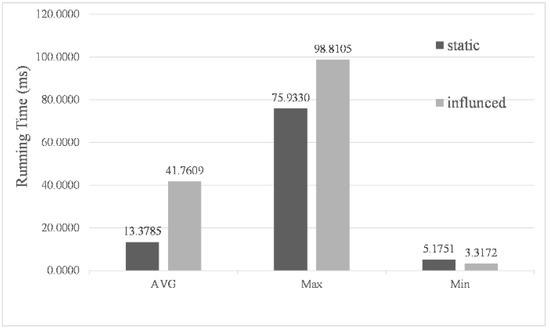 In the simulation experiments, the actual navigating time corresponding to each cycle of the algorithm was 0.1 s. Considering the practical significance of the algorithm, the calculation time of each cycle must be less than 0.1 s to ensure the real-time update for the navigation path of the USV. Figure 12 shows the statistical results of the calculation time for 50,113 cycles under the presence (influenced) and absence (static) of environmental factor impact. Due to considering environmental impact, the kinematic model and the evaluation function were more complex, thus increasing the calculation time of the algorithm. Nevertheless, the average calculation time of each cycle was only 0.0418 s, with the longest time no more than 0.1 s, which fully proves the real-time performance of the algorithm.
