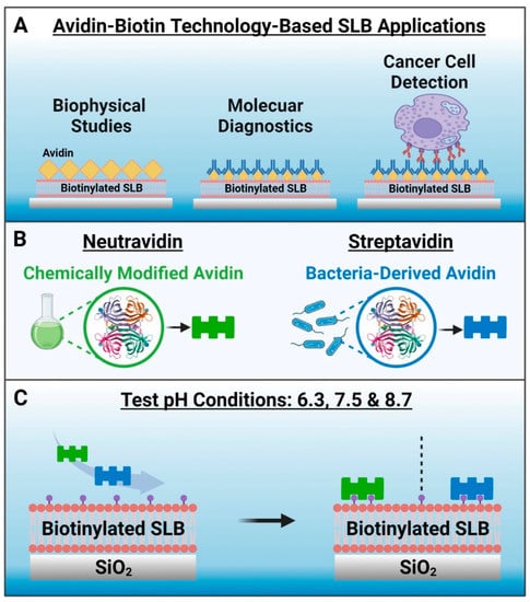 Avidin–biotin binding is an exceptionally strong and naturally occurring noncovalent interaction that has been utilized in numerous biosensing and biotechnology applications [,,,,,]. The highly specific and stable nature of avidin–biotin binding across various environments (e.g., diverse temperature and pH ranges) enables the specific capture and recognition of biomolecules that can be useful for applications such as biosensing, immunoassays, and targeted drug delivery. Moreover, the avidin–biotin interaction has been utilized in nanoscale drug delivery, diagnostic, and biosensor systems due to its favorable merits such as ease of functionalization, efficiency, and stability [,,,,]. The main feature of these nanotechnology-focused applications lies in the modification of interacting surfaces with biotin- and/or avidin-conjugated biomolecules, either directly or through multi-step binding sequences and the specifics of the surface modification can be tuned according to the application needs. One emerging use of avidin–biotin technology is in the field of supported lipid bilayer (SLB) coatings [], which are antifouling cell membrane mimics that are formed through the self-assembly of phospholipid molecules on solid surfaces and are widely used in biosensor development [,,,]. Generally, biotinylated lipids are incorporated in the SLB that acts as a platform upon which avidin or related protein analogues are specifically attached via biotin coupling, and such platforms can be used in various biosensing applications ranging from fundamental biophysical studies to molecular diagnostics and cancer cell detection [,,,,,,,,,,,] (Figure 1A).