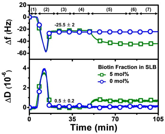 We may also add a brief remark concerning how our Neu and Strep adsorption data compare to past QCM-D data reported in the literature. Previous results have shown that nonspecific Neu adsorption behavior onto inorganic surfaces can be variable and unpredictable, likely due to protein aggregation []. In our experiments that focused on specific binding of Neu and Strep to biotinylated SLBs, we used freshly prepared samples to minimize aggregation-related issues, while there were some differences in the trend in QCM-D responses observed in our study, as compared to past SLB studies. For example, we observed less Neu adsorption at pH 7.5 compared to other QCM-D data reported at similar pH conditions (i.e., pH 7.2) but with higher Neu concentration and/or biotin fraction in the SLB [,,]. On the other hand, the QCM-D responses for Strep adsorption in our experiments are consistent with reported literature values in most cases [,,,]. These results also support the reliability of using Strep to functionalize SLB-based coatings via biotin coupling while Neu yields more variable results.