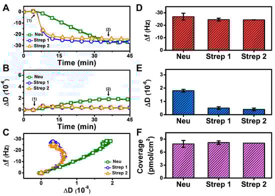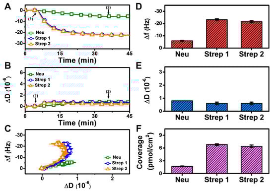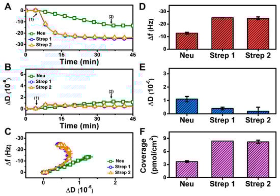 QCM-D measurement responses for Neu and Strep attachment to biotinylated SLB platform at pH 7.5. Time-resolved QCM-D (A) frequency (Δf) and (B) energy dissipation (ΔD) for protein addition. The initial baselines correspond to the shifts for a biotinylated SLB and protein was added starting at t = 5 min (arrow 1), followed by buffer washing from t = 35 min (arrow 2). (C) Time-independent curves of Δf vs. ΔD shifts corresponding to data in panels (A,B). Final (D) Δf and (E) ΔD shift values along with (F) maximum surface coverage of adsorbed protein molecules on the biotinylated SLB surface are reported as mean ± standard deviation from n = 3 experiments.