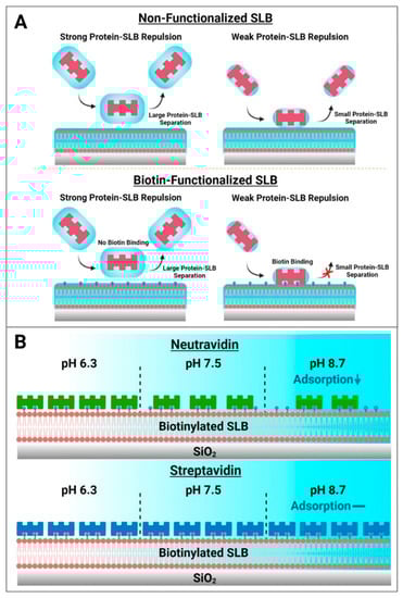 Summary of how biotin-binding proteins attach to biotinylated SLB surfaces and practical implications for biosensing applications. (A) Two-step model of how biotin-binding proteins come into contact with lipid bilayer surfaces. Electrostatic interactions modulate the magnitude of the equilibrium separation distance between contacting protein molecules and the SLB surface. In the absence of biotinylated lipid receptors, protein molecules may transiently contact a zwitterionic lipid bilayer but will not adsorb stably and the interaction is fully reversible independent of this separation distance. However, in the case of SLBs containing biotinylated lipid receptors, sufficiently close proximity of a contacting protein molecule to biotinylated lipid receptors (small separation distance) can result in strong binding, resulting in irreversible protein attachment. (B) Schematic illustration of Neu and Strep protein adsorption trends for SLB functionalization. Neu adsorption to biotinylated SLBs occurs in a pH-dependent manner, while Strep adsorption occurs in a pH-independent manner that can be useful for reliable surface functionalization.