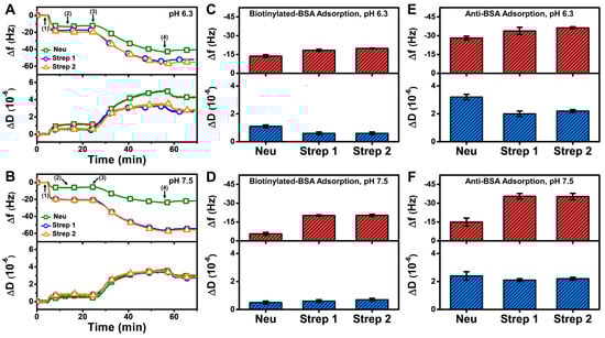 In addition, anti-BSA binding in the case of the Neu-functionalized SLB platform at pH 6.3 led to Δf shifts around −28.1 ± 1.5 Hz and ΔD shifts around 3.2 ± 0.2 × 10−6, while corresponding Δf shifts around −14.9 ± 3.2 Hz and ΔD shifts around 2.4 ± 0.3 × 10−6 occurred at pH 7.5 (Figure 8E,F). On the other hand, the measurement responses were appreciably larger for Strep-functionalized SLB platforms, and the corresponding Δf and ΔD shifts were around −36 Hz and 2 × 10−6, respectively. Taken together, these results demonstrate that Strep proteins have superior and more reliable performance for antigen-antibody detection involving SLB platforms and are hence preferable over Neu for such biosensing applications.