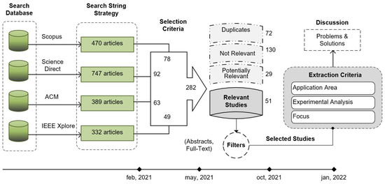 This section is built based on the structure of a systematic review (Kitchenham guide—Section 5. Conducting the review) [20,21]. From this approach, two criteria identify relevant studies (51 articles) and potentially relevant studies (29 articles), depending on how much they directly contribute to the research questions. Moreover, the third criterion refers to non-relevant studies (130 articles), i.e., those that do not respond to the RQs raised. In addition, duplicate studies were also filtered. This study reviewed inclusion and exclusion criteria, which are essential features to determine the literature review’s relevance. The exclusion criteria were: