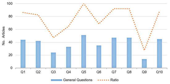 With the relevant studies and groups identified, the quality assessment summary in Figure 3 shows that, on average, each article answers 70% of the quality questions applied. More than 45 articles answer five questions, which can partially contribute to possible solutions for the RQs raised above (Stage A). On the other hand, regarding the research question Q5 about defined application areas, 51 studies are directly related to seismic–volcanic monitoring systems, where more than 44 investigations raised clear objectives, analysis, and details of the data used (Q1, Q7, and Q8). In addition, 33 articles show results based on comparative or control groups (Q4).