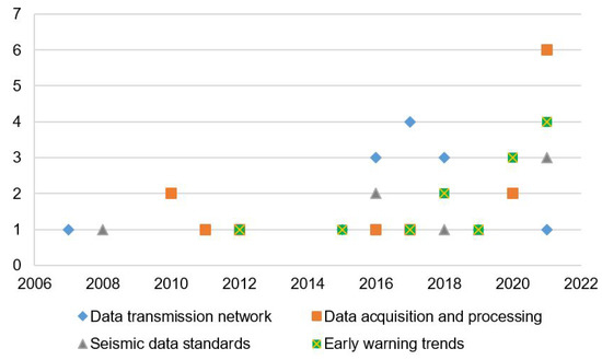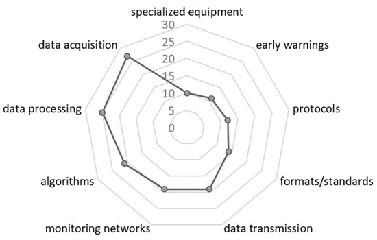 Figure 4 represents topics identified within the 51 relevant studies, where researchers have placed greater emphasis on identified problems for at least one of the four identified areas, and solutions have been prioritized for the following topics. Seismic data acquisition (30 articles) is the most researched area, followed by data processing (25 articles), most of which are based on the development of algorithms (23 articles). Furthermore, several authors have emphasized solutions to optimize seismic monitoring networks and ad hoc alternatives for data transmission (19 articles). On the other hand, it can be seen that the number of studies for the development of communication protocols (15 articles) is less because several investigations assume ideal systems without a loss of information; in addition, redundancy for seismic data is not considered. Regarding specialized equipment, there is great progress and diversity among sensors and dataloggers that meet quality standards, robustness, low energy consumption, storage capacity, and compatibility with communication formats and acquisition systems for more than a decade; therefore, this field is currently developed (less than nine articles). Finally, there are specific studies (11 articles) in the EEW field related to exclusively to find different methods for data processing time reduction and generate early warnings with greater precision. However, from the EEW approach, greater emphasis has not been placed on the stages behind the processing, such as data transmission and acquisition, which contribute significantly to the availability of information in the SDCs.