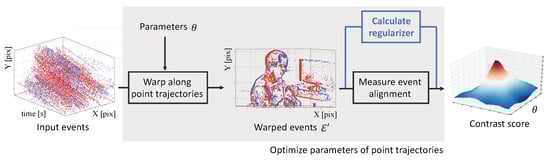 Proposed modification of the contrast maximization (CMax) framework in [,] to also account for the degree of regularity (collapsing behavior) of the warp. Events are colored in red/blue according to their polarity. Reprinted/adapted with permission from Ref. [], 2019, Gallego et al.