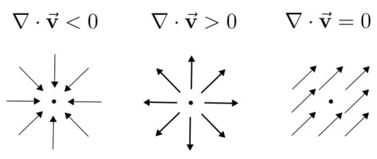 Divergence of different vector fields, . From left to right: contraction (“sink”, leading to event collapse), expansion (“source”), and incompressible fields. Image adapted from khanacademy.org (accessed on 6 July 2022).