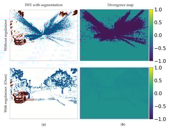 In the second step of CMax, several event-alignment objectives have been proposed to measure the goodness of fit between the events and the model [,], establishing connections between visual contrast, sharpness, and depth-from-focus. Finally, the choice of iterative optimization algorithm also plays a big role in finding the desired motion-compensation parameters. First-order methods, such as non-linear conjugate gradient (CG), are a popular choice, trading off accuracy and speed [,,]. Exhaustive search, sampling, or branch-and-bound strategies may be affordable for low-dimensional (DOF) search spaces [,]. As will be presented (Section 3), our proposal consists of modifying the second step by means of a regularizer (Figure 2, top branch).