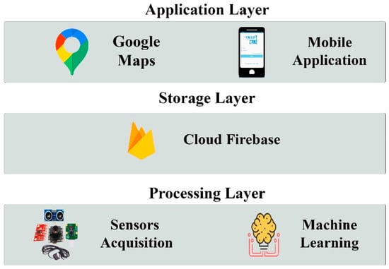 The software architecture of the proposed system consists of three layers, namely the data processing layer (DLP), the data storage layer, and the application layer. Figure 2 shows the layered software architecture. Section 3.2.1, Section 3.2.2 and Section 3.2.3 describe the specifications and functionality of the three software layers used in the proposed system.