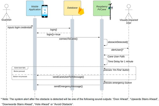 This layer is used to give access to the guardian through his/her mobile handset. The guardian receives the user location and notifications from the cane through the DSL. Using Android Studio, four software modules were developed, namely user interface, user profile and authentication, notification, and GPS tracking using Google Maps. The system sequence diagram is shown in Figure 4 and is described as follows:
