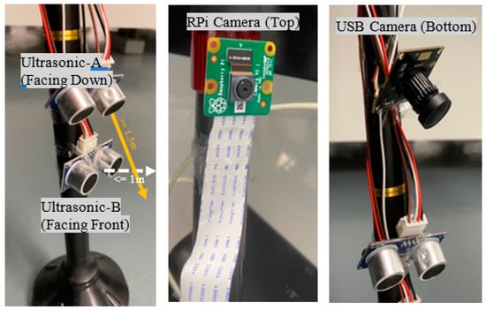 The smart cane design includes two cameras as shown in Figure 6. Each camera is dedicated to a US sensor. The upper camera is associated with the US sensor A, whereas the lower one is associated with US sensor B. When US sensors A or B detect an obstacle, the respective camera takes a shot.