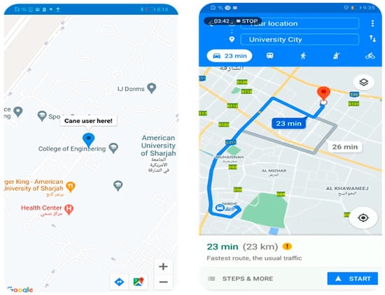 A Google Maps API key and a Firebase query are used to obtain the latest location shared. Once the tracking option is selected, after connecting the cane, the guardian is directly forwarded to the Google Maps app, where the latest retrieved location is marked. The guardian uses the marker to obtain the directions to the cane user using the Google Maps app. Figure 10 shows samples of GPS tracking and Google Maps used in the app.