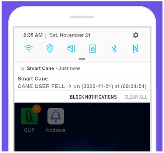 After connecting to the cane, the guardian will be able to receive notifications sent from the cane in real time. The notifications used in this app are foreground notifications. This enables the app user to receive notifications even after closing the app. A broadcast receiver was also utilized to allow notifications to run immediately after restarting the phone. Figure 11 presents a sample of a notification received due to a fall encountered.