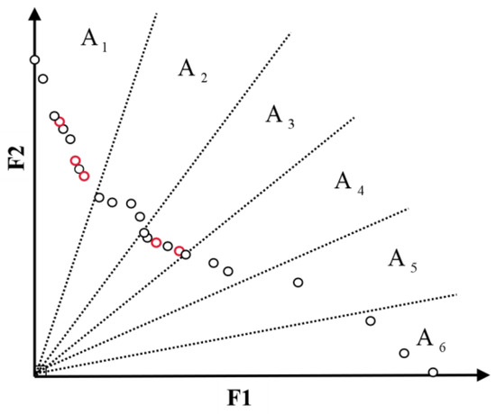 In order to improve the efficiency of IAMOPSO, this paper adopts the following adaptive method to select the guiding particle: When ECS is improved, the population maintains the state of exploitation, and selects the particle closest to the origin in ECS set as . when the ECS is not improved in a long time, the population enters the state of exploration, and selects an individual in the sparse region of the ECS set as . The ECS set is partitioned by angle in each generation, as shown in Figure 5. When the population is in an exploitation state, the algorithm calculates the Euclidean distance between each point and the origin. The distance between particle A and the origin is the smallest, so particle A is selected as . When the population is in exploration state, particle A can no longer effectively guide particles, while particle B in the sparse region can guide particles to explore a uniformly distributed Pareto front. Particle B is selected as in this iteration.
