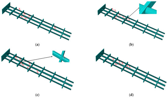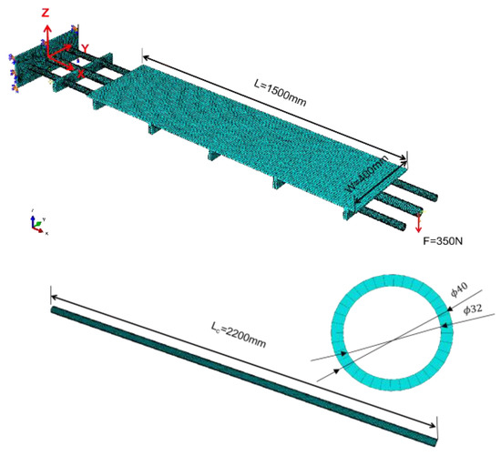 In this section, to demonstrate the universality of IAMOPSO algorithm for sensor layout applications, numerical and experimental verifications are performed on a complex plate-beam structure, which consists of three beams and one plate. The length of the beam is , the outer radius is and the inner radius is The length of the board is 1500 mm, the width is 400 mm, and the thickness is 8 mm. The board is 470 mm from the fixed end. The distance between the main beam (middle beam) and the two symmetrical sub-beams is 130 mm. The ribs are 400 mm long, 50 mm wide, and 20 mm thick. The distances from the six ribs to the fixed end are 250 mm, 520 mm, 870 mm, 1220 mm, 1570 mm, and 1920 mm, respectively, as shown in Figure 10. The Young’s modulus is , the Poisson’s ratio is , and the density is . In the simulation, a static load of 350 N was applied to the free end of the beam.