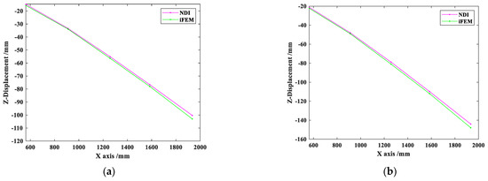 where is global stiffness matrix, which is related to section position ; is the global load vector, which depends on and . The matrix-vector equation provides a solution for the nodal freedom of structural deformation, . Then, through Equation (6), the deformation of any section position can be obtained by interpolation. According to Equation (2), the deformation of any point can be calculated eventually.