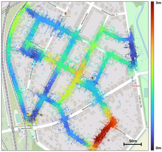 Result of our approach. LiDAR point clouds overlaid on top on OSM. Colors reflects the position error (m).