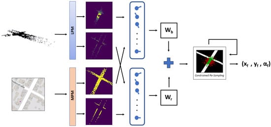 Our full method. The LiDAR point cloud and OSM region of interest are processed by the LiDar processing module (LPM) and map processing module (MPM), respectively, to produce four images, a pair of top-view road images and a pair of top-view building edges, with each pair containing a real and a simulated point cloud image. The two pair of images are processed by a dual input particle filter which produces a first estimate of the vehicle position, followed by a road check to verify if the estimated position is on the road or not. In the latter case, the constrained resampling is triggered, until the road check condition is satisfied.