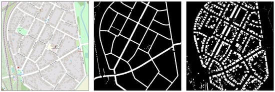 By using color segmentation (mostly solid white for roads and a specific shade of grey for buildings), combined with morphological transformations such as dilation and erosion, we are able to generate buildings and road masks that we can later use to generate simulated LiDAR top-view images. When extracting the roads, we use the standard OSM layer style. However, for the buildings, we use the public transport layer, to avoid noise resulting from building numbers and business names. The morphological transformations are mostly applied to the road mask, in order to close holes caused by overlaid street names on the images, with a kernel size (5,5) for the dilation and (3,3) for the erosion. It is possible generate our own layers with styles that do not include any overlaid text, but that is out of the scope of this work, and we would rather use already available data. The resulting roads and buildings masks of an area in OSM are shown in Figure 3.