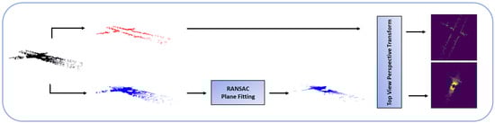 LPM. The LiDAR point cloud is divided into two sections using the height value of each point, a top section (capturing surrounding buildings walls) and bottom one (capturing the road). The bottom section undergoes RANSAC plane fitting to extract the road, then the two point clouds are projected to produce two top-view point cloud images.