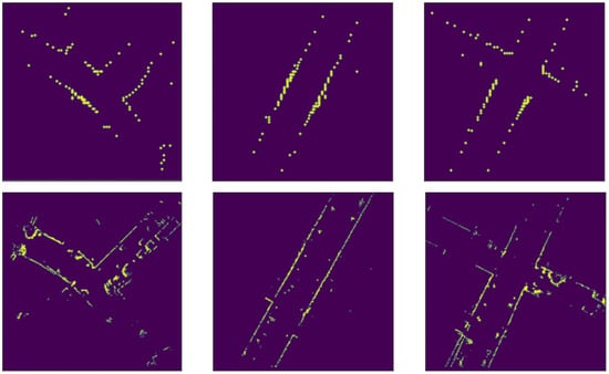 For the simulated top section of the point cloud, we proceed to use raycasting on the building mask at the same position and region of interest used to generate the simulated road point cloud. Raycasting is a common method used to simulate LiDAR point clouds in autonomous driving cars simulators such as Carla []. By first detecting the obstacles in the surrounding environment (which are shown in the building mask in our case), we can use 2D raycasting and simulate a beam of light that stops when it hits an obstacle. By doing that in a 360-degree fashion, we are able to generate simulated LiDAR images. An example of this approach can be seen in Figure 5, and its results are compared with the images from the LiDAR sensor in Figure 6. The MPM is illustrated in Figure 7.