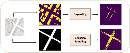 MPM. The OSM region of interest is segmented to produce a building and a road mask. Raycasting is applied to the building mask, whereas rejection sampling on the road mask with a Gaussian proposal is applied to the road mask, in order to produce two simulated top-view point cloud images.