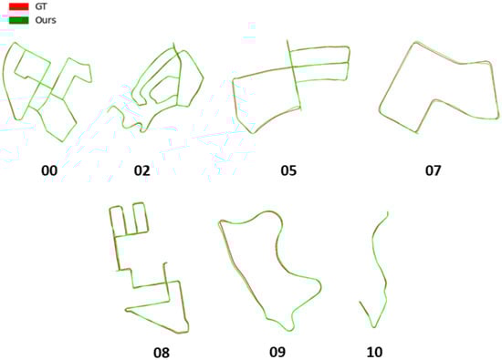 For context, we list the lengths of the tested KITTI sequences in Table 1. The results of our cross-modal localization approach, in comparison to other previously proposed methods in the literature are shown in Table 2 and Table 3. For both translation and rotation results, we use the accumulated mean error defined as to report our results, where and are the predicted and ground truth poses, respectively, at the timestamp i. We compare our results to [], which proposes a method to localize LiDAR point clouds in OSM by using handcrafted feature descriptors, [] which proposes a method to localize LiDAR point clouds in satellite maps by using the correlation between the semantic segmentation of both modalities and [], which presents a road-constrained monocular visual localization method. The results tagged [] are those obtained when using the output of the ICP motion model only without the subsequent proposed observation model. Values marked N/A and rotation error values were not provided by the publications. Figure 9 shows a qualitative comparison between our final results and the ground truth.