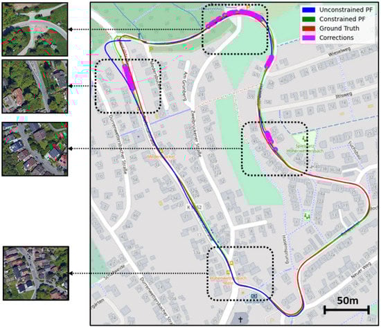 Figure 10 also shows that our method does not rely on the constraint all the time and/or only tries to stay within the limits of the road. Instead, we are able to track our position correctly most of time by using the input data, and only trigger the constrained resampling in some corner cases, i.e., LiDAR scans are blocked by trees. As an additional example of a good case scenario, we show a region where the localization was successful, which can be explained by the fact that no major occlusion is occurring in that area, and that most structures present on and around the road are correctly represented in OSM.