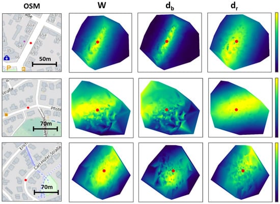 Interpolated heatmaps representing the weight distribution of the particles for different weights formulation, according to Equation (1). Red dots represent the true vehicle position.