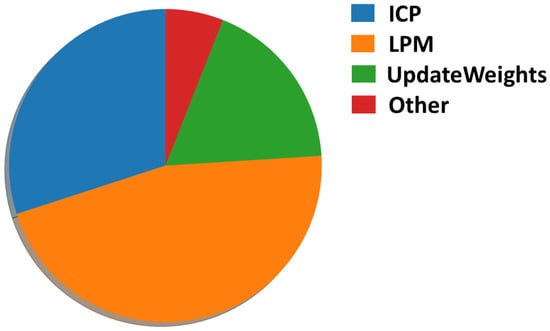 Runtime analysis. Our method runs at a maximum speed of 10 Hz. The LPM takes the most amount of time with more than forty percent of the total runtime, followed by ICP with thirty percent and the step with a little bit less than twenty percent. The constrained resampling, when triggered, consumes less than one percent of the total runtime on average. Figure 13 shows the runtime distribution for each part of the algorithm.