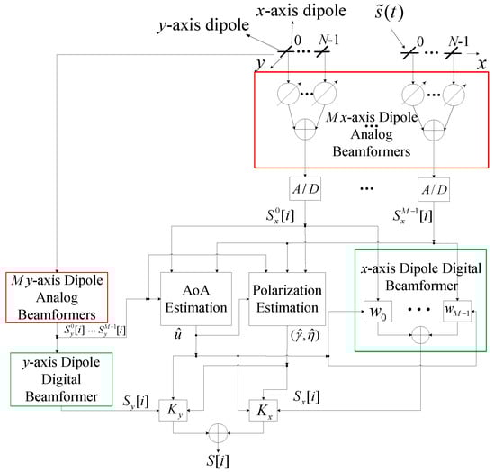As shown in Figure 1, we consider a uniform linear hybrid dual-polarized array with M subarrays, each including N electromagnetic vector sensors (EMVS) [,,,]. Each EMVS has two orthogonal dipoles collocated along x- and y-directions, called x- and y-axis dipoles respectively. They are used to measure the components of the incoming electric field projected onto the directions of x- and y-axes. The signals from the x- and y-axis dipoles of each subarray are combined after phase shifter to form the subarray output signals, respectively, followed by analog-to-digital (A/D) conversion. The digital signals from the x- and y-axes are jointly used to estimate the AoA information and polarization parameters, and are weighted and summed to form the output signals, respectively. In Figure 1, the radio frequency and down conversion modules are suppressed for simplicity. Note that the module named “M y-axis Dipole Analog Beamformers” shares the same signal processing with the one named “M x-axis Dipole Analog Beamformers” shown in the red box. Likewise, the module named “y-axis Dipole Digital Beamforemer” has the same components with “x-axis Dipole Digital Beamforemer” in the green box.
