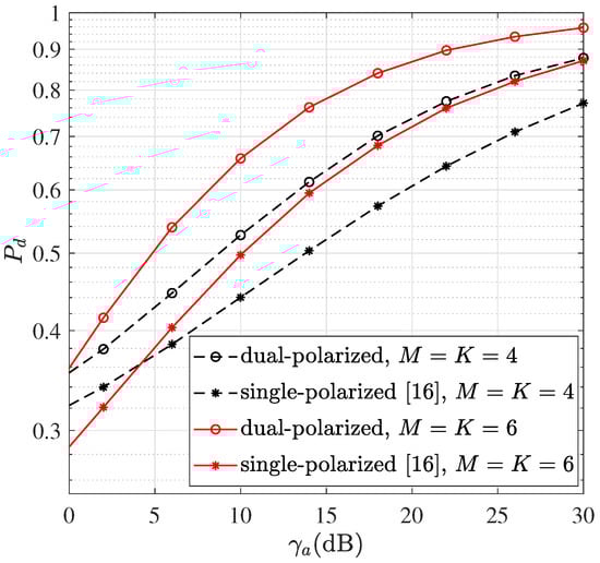 Figure 2 compares the detection probability of , , versus using dual-polarized and single-polarized (x-axis dipoles) arrays, where the number of EMVSs in each subarray, N, is fixed to be 12 and the number of reference signals, I, is set to be 8. We define the probability of finding the index of differential signals with the largest amplitude as . As shown in the figure, the dual-polarized array with EMVS is superior to the single-polarized array in [] that only uses one axis dipoles in terms of . It indicates that the use of dual-polarized arrays has a better calibration capability, and thus improving the accuracy of . Moreover, using more subarrays leads to higher detection probability with the increase of . Given the number of antennas in a subarray, N, as the number of subarrays, M, increases, more beams will achieve higher SNR for cross correlations and thus more accurate . Because the number of N determines the width of each beam, the boundary of M depends on N. The increasing N generally results in a larger M.