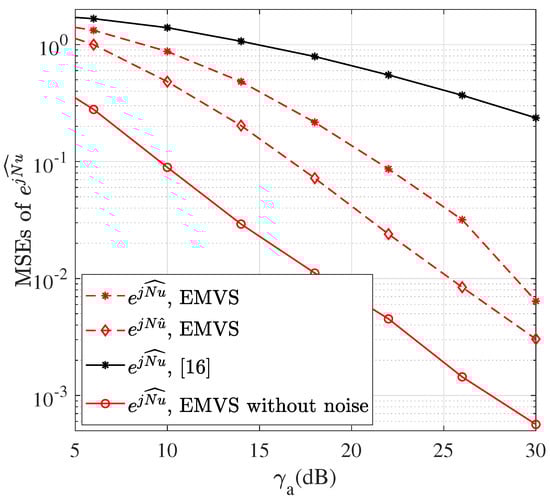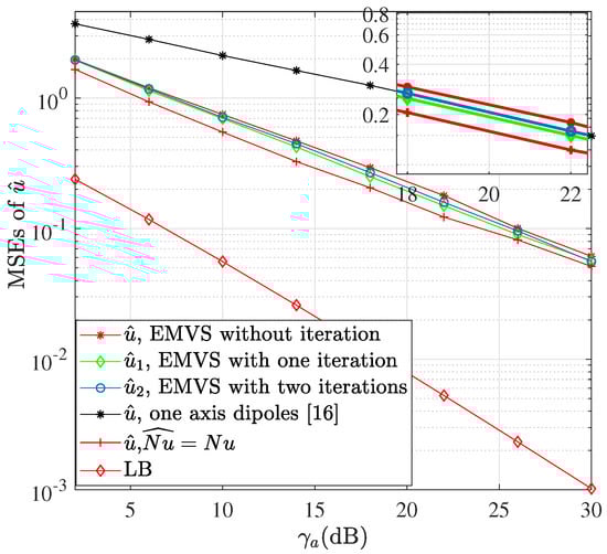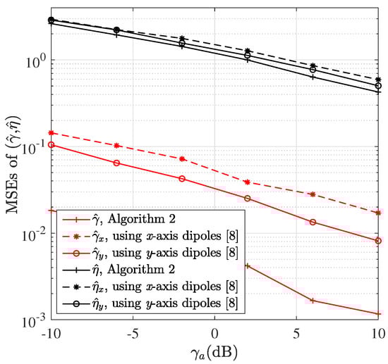 Figure 5 shows the MSEs of polarization parameters versus , where and . It can be seen that the MSEs of and using Algorithm 2 for power calculation are lower than those using only one axis dipoles for power calculation in [], which is consistent with the performance analysis in Section 5.2.
