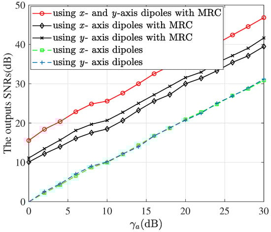 Figure 6 shows the SNRs of the combined signal defined in (4) with MRC, and of the signals only using x- or y- dipoles without MRC. The circle marker denotes the output SNRs with MRC using the total received power of signals on x- and y-axis dipoles for the cross-correlation-to-power ratio calculation, while the diamond or cross marker denotes those with MRC using x- or y-axis dipole for ratio calculation. It is seen that the former achieves higher output SNRs than the latters due to the improved accuracy of polarization parameter estimation, i.e., more accurate MRC coefficients. The hybrid dual-polarized array with MRC produces far higher output SNRs than the single-polarized array with one axis dipoles without MRC. Note that the simulated output SNR using x- and y-axis dipoles with MRC at dB is given by 26.4 dB. It is close to the SNR that is achieved by the arrays perfectly aligned with the real AoA and polarization state, given by 10 + 10 lg(6 × 8) = 26.8 dB.