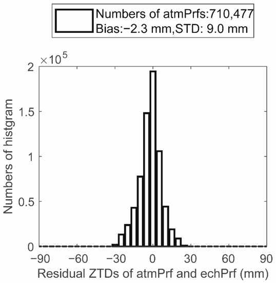 Between 1 January and 31 December 2008, more than 710,500 effective RO events occurred, with an average of about 2000 RO events per day having accurate inversion results. The atmospheric physical parameters corresponding to each event in this experiment were obtained by interpolation of the ECH model, so the number of events counted during this time period is consistent with the number of successfully retrieved atmospheric profiles. Due to the high credibility of the ECH model results, we use the 3 sigmas principle to remove events with occZTD deviating greatly from the corresponding echZTD value. The problematic data are less than 1%. There were 710,477 data points in the final comparison between occZTD and echZTD. Figure 1 shows the statistical diagram of the difference δ between the matched occZTD and echZTD data. It can be seen from Figure 1 that δ is normally distributed with a bias of −2.3 mm, indicating that the refractive index of the occultation data is smaller than that of the ECMWF model; the standard deviation is 9.0 mm.