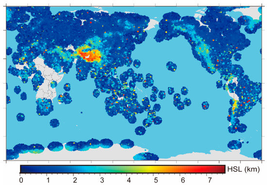 Figure 2 shows the global distribution of the matching results of occZTD and sonZTD, where the color indicates the lowest point of the common height of matched events in HSL, which is consistent with the distribution of the surface elevation. Figure 3 shows the statistical diagram of the difference between the matched occZTD and sonZTD data. Similar to the data preprocessing of occZTD and echZTD, we removed the unreliable occZTD and sonZTD data pairs by the 3 sigmas principle. The final number of statistical points is 208,536, which is one-third of the number. is normally distributed (the bias is 0.8 mm; the standard deviation is 17.6 mm, which is greatly higher than that of ). This phenomenon is mainly due to the temporal and spatial inconsistency between the occZTD and sonZTD data.